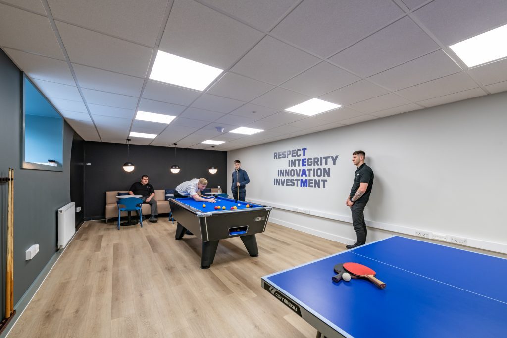 - Breakout Area: Recognising the importance of relaxation and informal meetings, we have created a stylish breakout area where employees can enjoy a game of pool, table tennis, unwind or have informal discussions. This space was designed to be both functional and comfortable, promoting creativity and wellbeing.